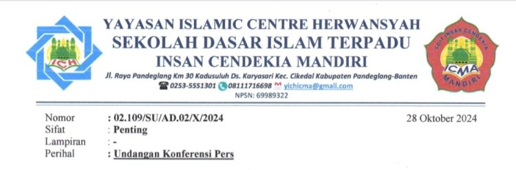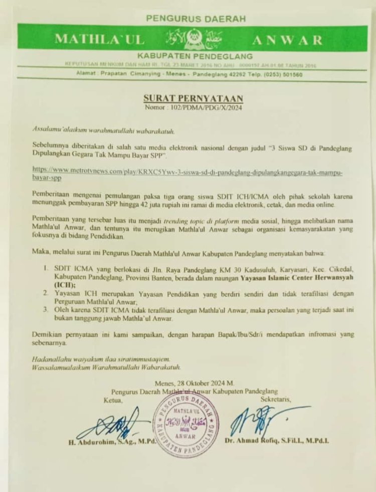 Hal tersebut juga di respon oleh pengurus Daerah Mathla'ul Anwar (MA) Kabupaten Pandeglang, dalam surat Pernyataan Nomor/PDMA/PDag/X/2024, dalam isi surat pernyataan tersebut menyatakan tentang, (1) SDIT ICMA yang berlokasi di Jln. Raya Pandeglang KM. 30 Kadusuluh, Karyasaei Kec. Cikedal Kabupaten Pandeglang, Provinsi Banten berada dalam naungan Yayasan Islamic Centre Herwansyah (ICH).