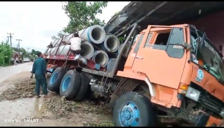 Diduga Jalan Licin Mobil Bermuatan Beton Paku Bumi Tergelincir Menabrak Rumah Warga.
