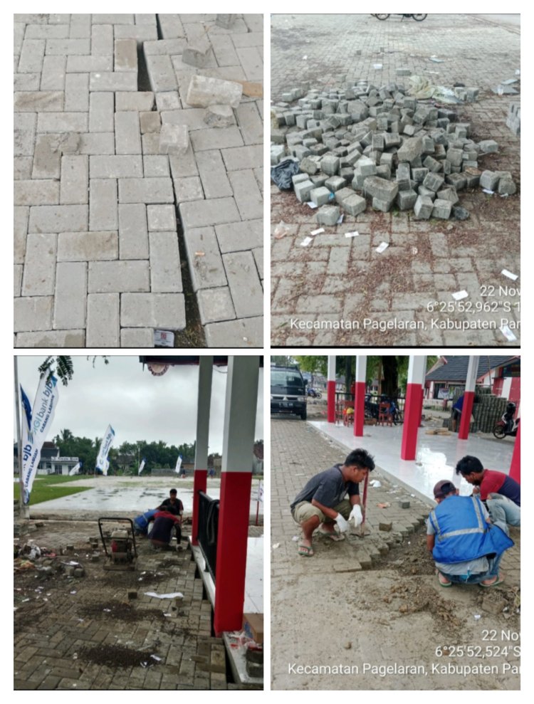 Selain itu, sejumlah material paving block yang digunakan tampak banyak yang patah dan tidak layak pasang, sehingga memunculkan pertanyaan mengenai standar mutu bahan yang disuplai ke lokasi.