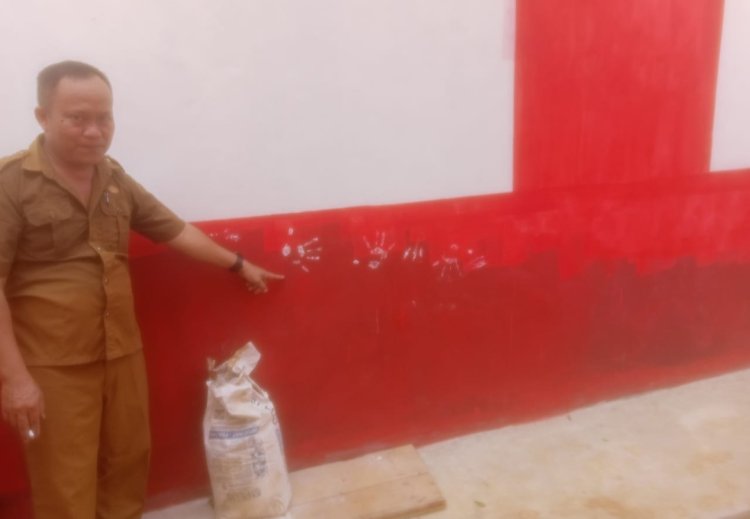 Pasalnya.' 'Saat awak media turun kelokasi pekerjaan pada Senin (28/10/2024) terlihat cat bangunan perpustakaan tersebut blontang-blonteng alias tebal tipis tak beraturan dan parahnya lagi terlihat kotor karena ada bekas beberapa telapak tangan yang menempel di dinding gedung perpustakaan tersebut yang disinyalir telah selesai pengerjaannya dan sialnya lagi Dindin keramiknya pun belang-belang.