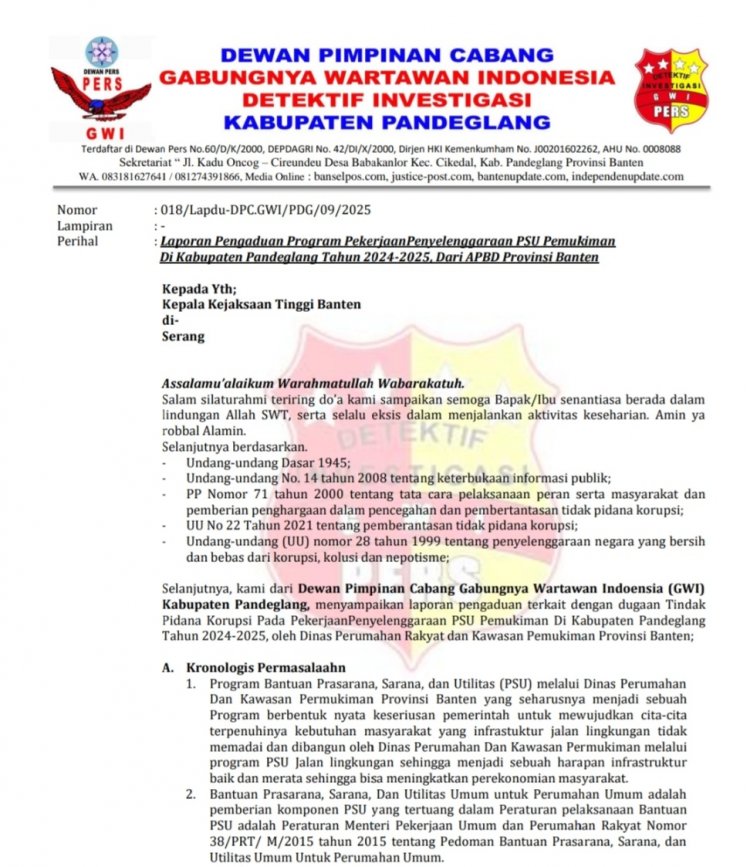 Justice-post.com, Pandeglang, Banten | Dewan Pengurus Cabang Gabungnya Wartawan Indonesia (GWI) Kabupaten Pandeglang, secara resmi melaporkan dugaan Kolusi , korupsi dan Nepotisme pada Program PSU Tahun 2024-2025 di Kabupaten Pandeglang Pada Dinas PRKP Provinsi Banten, Rabu, (25/09/2025).